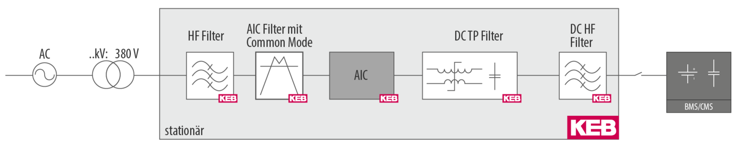 - Energieaufnahme aus dem Netz über den AIC (Active Infeed Converter, auch AFE – Active Front End genannt) → die Batterie wird geladen