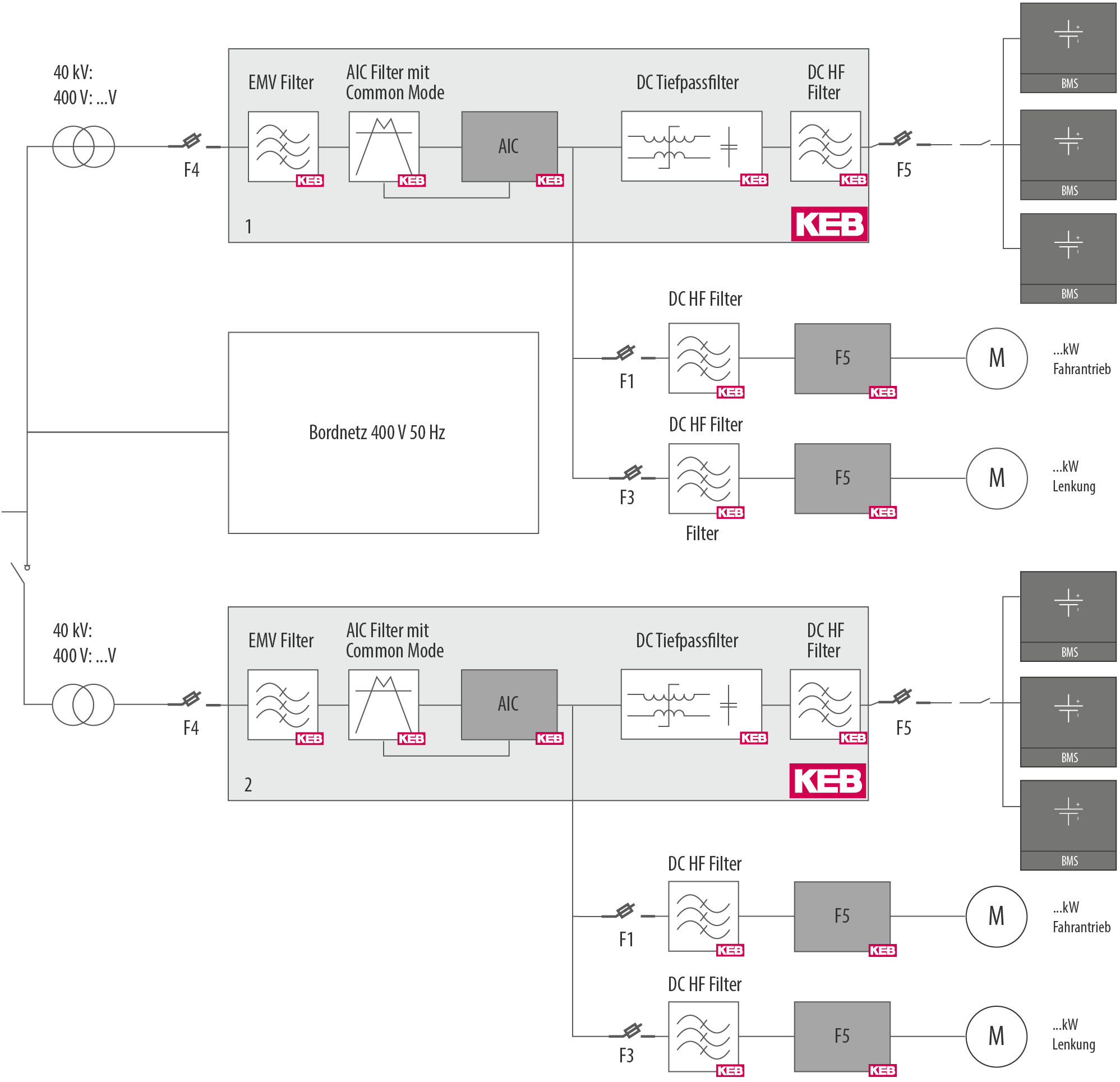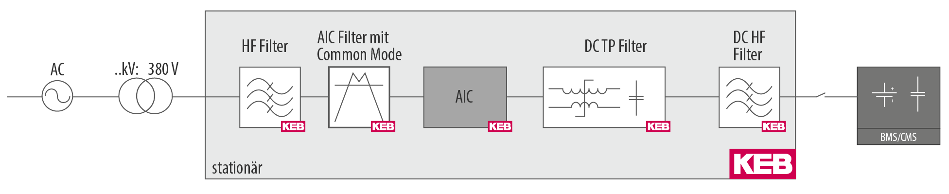 In den Systemen kommen bewährte Produkte aus dem Industrieumfeld zum Einsatz, die bei KEB entwickelt und gefertigt werden. Dies ermöglicht die Verfügbarkeit hoher Stückzahlen und kostenoptimierte Pakete. Neben der erforderlichen Hardware ist dabei die passende Applikationssoftware COMBIVIS auf Steuerungen von KEB integriert (auf CODESYS basierende Steuerungsapplikationen nach IEC 61131-3). Vorteile sind dabei unter anderem: